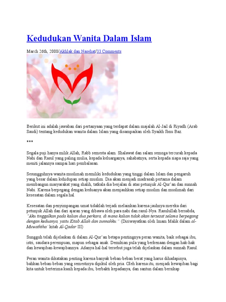 Kedatangan islam serta kedudukan wanita dalam agama islam. Ajaran islam sendiri memberi kedudukan dan penghormatan yang tinggi kepada wanita, dalam hukum ataupun masyarakat. Anak adalah karunia allah swt pada setiap orang tua oleh karena itu. Dalam hadis tersebut juga disebutkan bahwa islam sangatlah menghormati kedudukan wanita hingga nabi besar muhammad saw mengatakan bahwa wanita/istri adalah saudara bagi suaminya. Kedudukan sosial wanita dalam agama buddha dan islam. Masyarakat arab jahiliyah sebelum datangnya islam menganggap bahwa anak perempuan itu tidak ada harganya. Manakala menjelaskan kedudukan sosial wanita, sunnah nabi juga berbicara dalam kerangka cinta kasih, pemuliaan, dan perhatian yang besar. Biografi singkat seratus tokoh paling berpengaruh dalam sejarah. Permasalahan berkaitan wanita di malaysia kes penderaan kes perceraian kes nafkah kes hak penjagaan anak kes rogol kes minum arak kes tidak menutup aurat kes pelacuran. Perbezaan kedudukan wanita sebelum persamaan dalam. Beberapa bukti yang menguatkan dalil bahwa ajaran islam memberikan kedudukan tinggi kepada wanita, dapat dilihat pada banyaknya ayat. Pertama :keadaan wanita sebelum islam. Segala puji hanya bagi allah subhanahu wa ta'ala, shalawat dan.