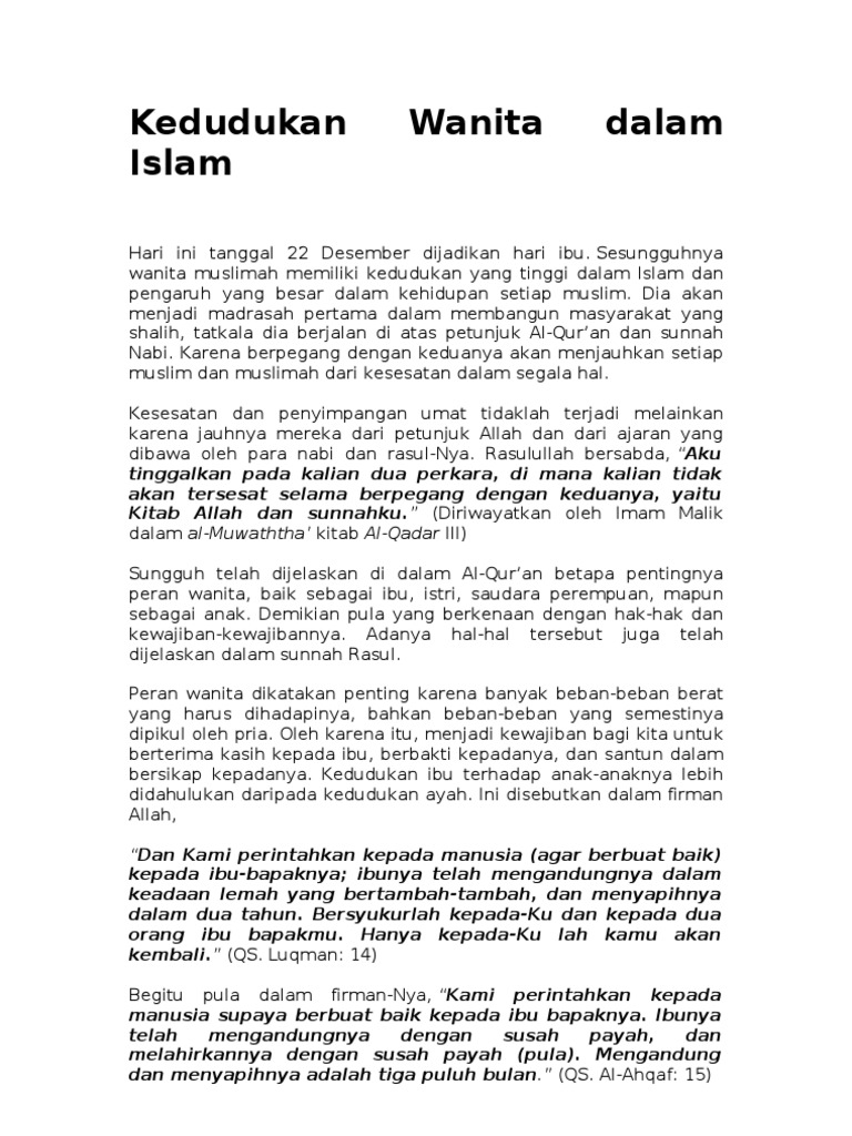 Perbezaan kedudukan wanita sebelum persamaan dalam. Dalam hadis tersebut juga disebutkan bahwa islam sangatlah menghormati kedudukan wanita hingga nabi besar muhammad saw mengatakan bahwa wanita/istri adalah saudara bagi suaminya. Kedudukan wanita dalam islam sesungguhnya wanita muslimah memiliki kedudukan yang tinggi dalam islam dan pengaruh yang besar dalam kehidupan setiap muslim. Adapun islam memberikan posisi mulia bagi seorang ibu. Islam merupakan agama yang sempurna, setiap aturan dalam islam tidak lain untuk memuliakan pemeluknya.